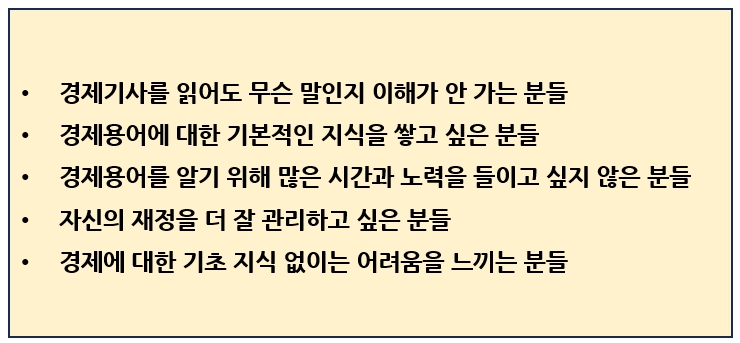 하지만, 이미 경제용어에 대해 깊은 지식을 가지고 계시거나, 경제 분야의 전문가이신 분들은 이 책이 기대만큼의 도움을 드리지 못할 수도 있습니다. 왜냐하면 이 전자책은 경제공부를 처음 입문하시는 분들을 대상으로 하고 있기 때문입니다.